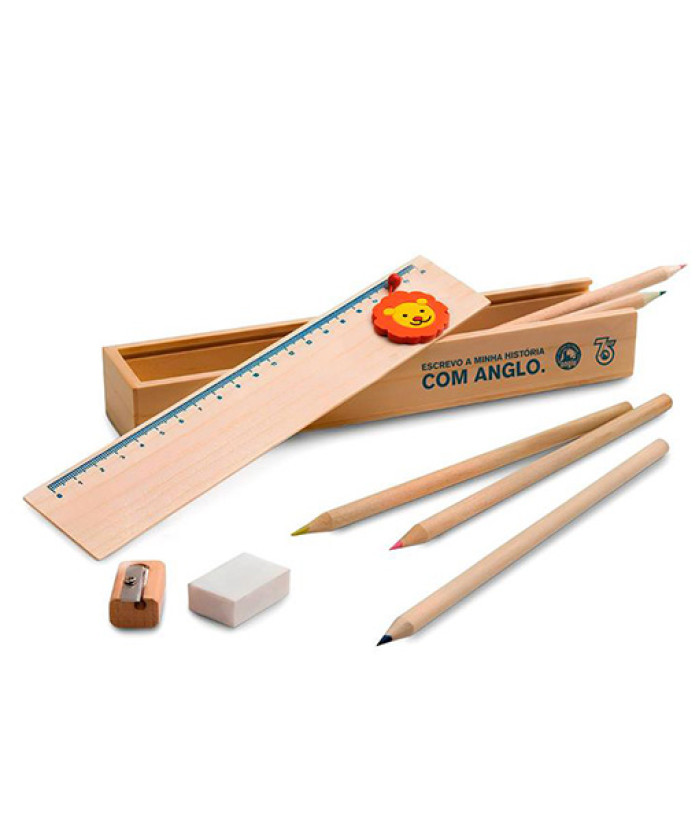 Conjunto de desenho fornecido em caixa de madeira. Incluso uma régua de 20 cm, seis lápis de cor, um lápis de grafite, um apontador e uma borracha.